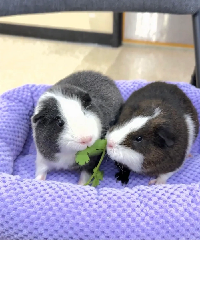 As a herd animal, guinea pigs enjoy and thrive with the company of other guinea pigs. At SCCR, guinea pigs are either bonded with a same gender mate OR a neutered male and a female can be bonded together. IF absolutely needed - a second guinea pig friend can be housed in a separate habitat close by so that each guinea pig can hear, smell and see the other.